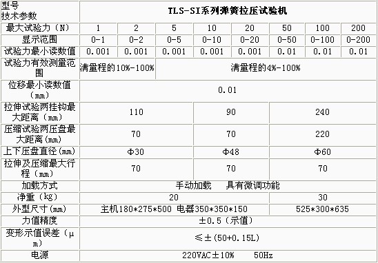 產(chǎn)品概述: TLS-SI系列雙數(shù)顯示拉壓彈簧試驗機采用集成電路、微機技術(shù)對位移、試驗力兩參數(shù)進行電子檢測、數(shù)字顯示并對試驗結(jié)果進行打印。施加試驗力為手動,還可以對負荷傳感器位移作自動修正。,適用于各種精密拉伸和壓縮螺旋彈簧試驗機及對脆性材料的強度測 功能特點: 數(shù)字顯示位移、負荷,彈簧疲勞試驗機廠家,精確直觀并對試驗結(jié)果進行打印 采用ISP技術(shù)編程,彈簧試驗儀,對負荷傳感器的變形自動修正 試驗力、位移任意點清零,一鼎彈簧試驗機,可任意設定檢測基準 具有峰值保持、過載保護等功能 技術(shù)參數(shù):