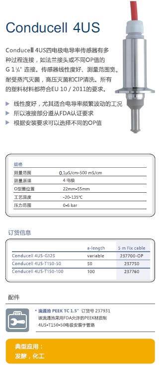Conducell 4US四電極電導率傳感器有多種過程連接,,如法蘭接頭或不同OP值的G 1¼”連接。傳感器線性度好、測量范圍寬。耐受蒸汽滅菌,,高壓滅菌和CIP清洗。所有的塑料材料都符合EU 10 / 2011的要求。