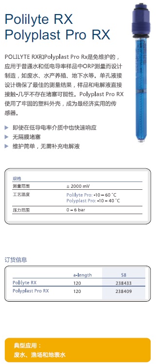POLILYTE RX和Polyplast Pro RX是免維護(hù)的,,應(yīng)用于普通水和低電導(dǎo)率樣品中ORP測量而設(shè)計制造,,如廢水、水產(chǎn)養(yǎng)殖、地下水等。單孔液接設(shè)計確保了最佳的測量結(jié)果,,樣品和電解液直接接觸-幾乎不存在堵塞可能性。Polyplast Pro RX使用了牢固的塑料外殼,,成為最經(jīng)濟(jì)實用的傳感器。