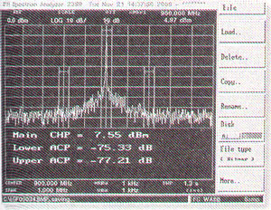 顯示的水平軸(頻率軸)中心頻率為900MHz,掃頻頻寬為1MHz,而每一小格代表l00kHz。頂部水平線(xiàn)表示0dBm,垂直方向每一格代表10dB。信號(hào)已經(jīng)被衰減了10dB,測(cè)量顯示的功率電平已考慮了此衰減。