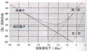 相鄰信道功率比(ACPR)或低電平IMD的測(cè)量要更困難,更需要注意頻譜分析儀的能力。圖2顯示了頻譜分析儀的熱噪聲、相位噪聲和第三、第五階交調(diào)失真與混頻器電平的關(guān)系。由于精確測(cè)量ACPR所需的動(dòng)態(tài)范圍接近或超出了很多頻譜分析儀的性能極限,所以必須全面考慮之后才有把握進(jìn)行正確測(cè)量。