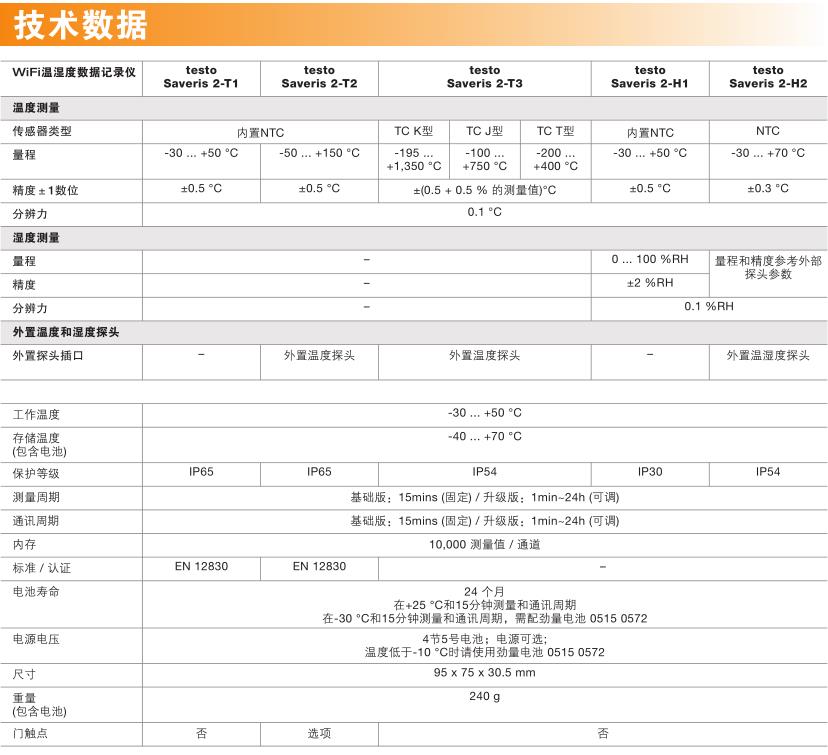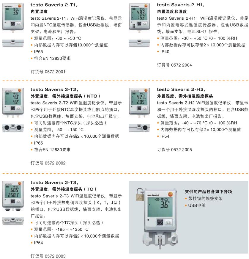 型號(hào) testo Saveris 2 T1 WiFi溫濕度記錄儀 testo Saveris 2 T2 WiFi溫濕度記錄儀 testo Saveris 2 T3 WiFi溫濕度記錄儀 testo Saveris 2 H1 溫濕度記錄儀 testo Saveris 2 H2 WiFi溫濕度記錄儀